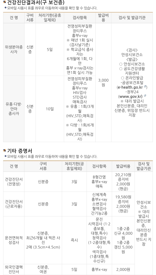 안성시 보건증 수수료, 처리기간출처 안성시보건소