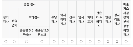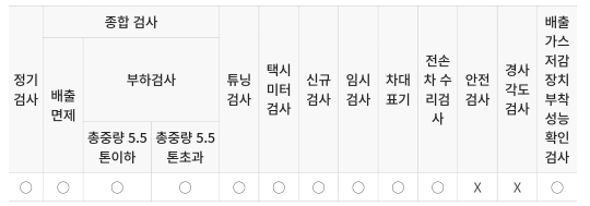 정기검사, 종합검사(배출면제), 종합검사(부하검사), 튜닝검사, 신규검사, 택시미터검사, 차대표기, 임시검사, 전손차수리검사, 배출가스저감장치부착성능확인검사