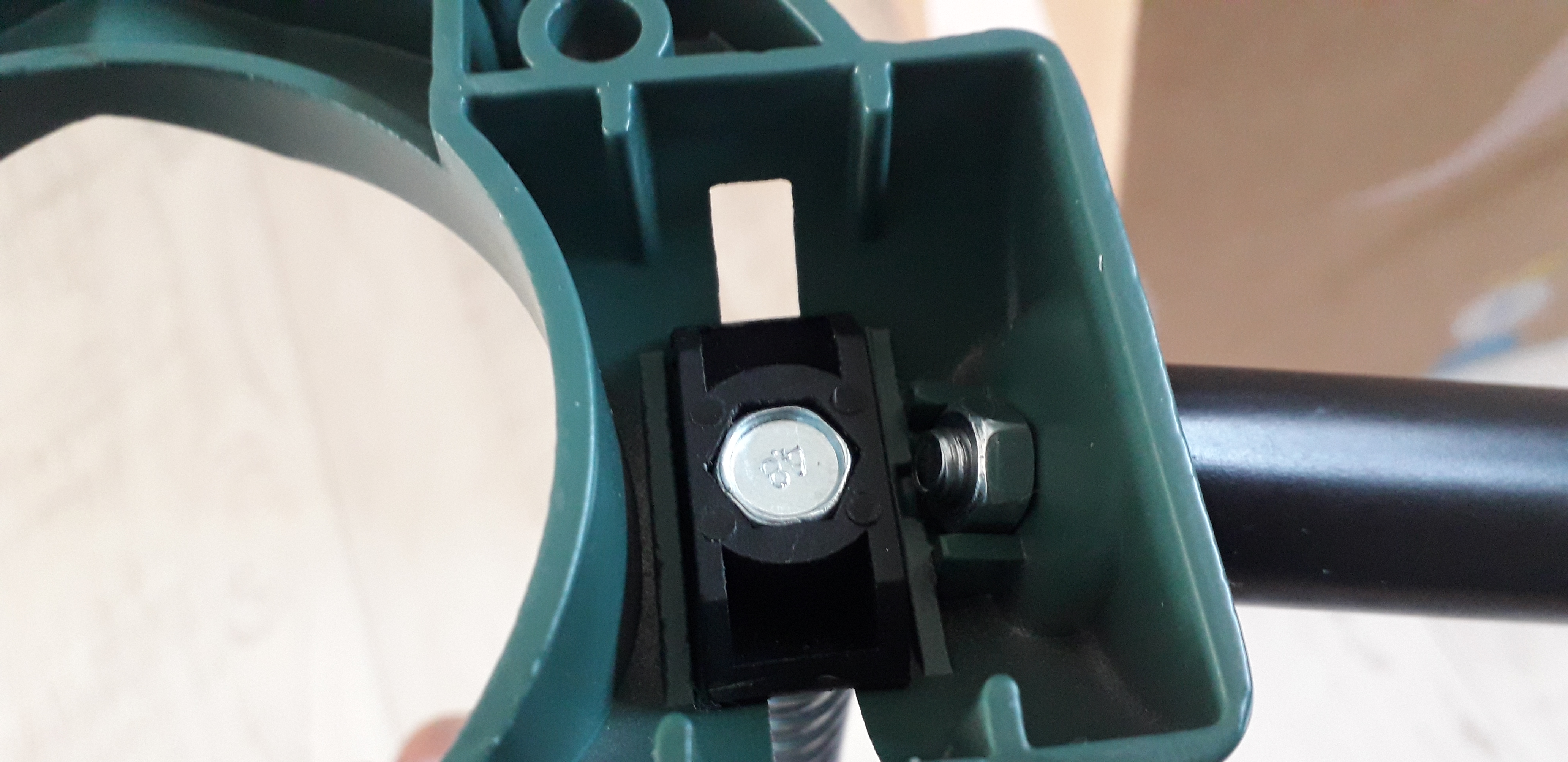 하단의 플라스틱 검은색 부품을 맞게 꼭으시고 너트를 손으로 가볍게 헛돌지 않게 잡아주시고 원형봉을 회전해 주시면 고정이 됩니다.원형봉을 돌리지 않고 너트를 조여서 고정하려면 되지도 않을뿐더러 힘들어요.