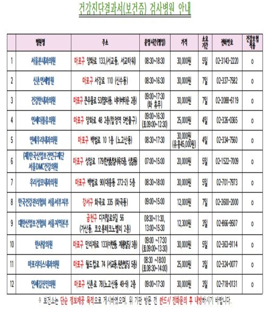 마포구 보건증 비용, 소요기간출처 마포구보건소