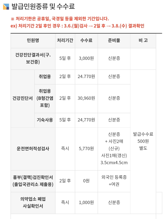 보건증, 건강진단서,적성검사 수수료, 처리기간