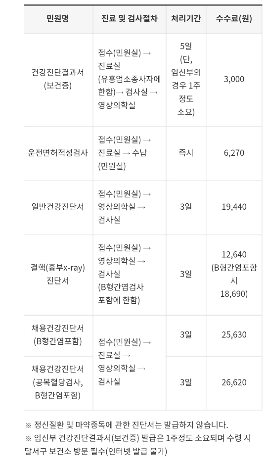 보건증, 건강진단서, 운전면허 적성검사, 폐결핵 등 발급 비용, 처리기간