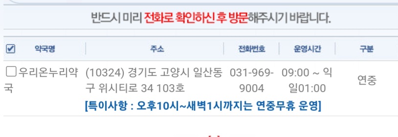 - 주엽1번출구약국: 일산서구 중앙로 1421 1층, 밤10시~새벽1시까지 운영