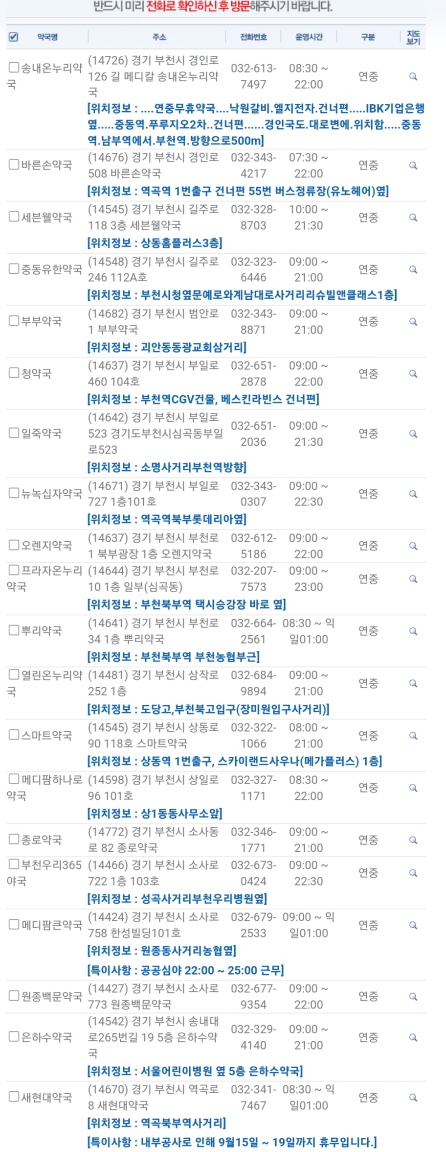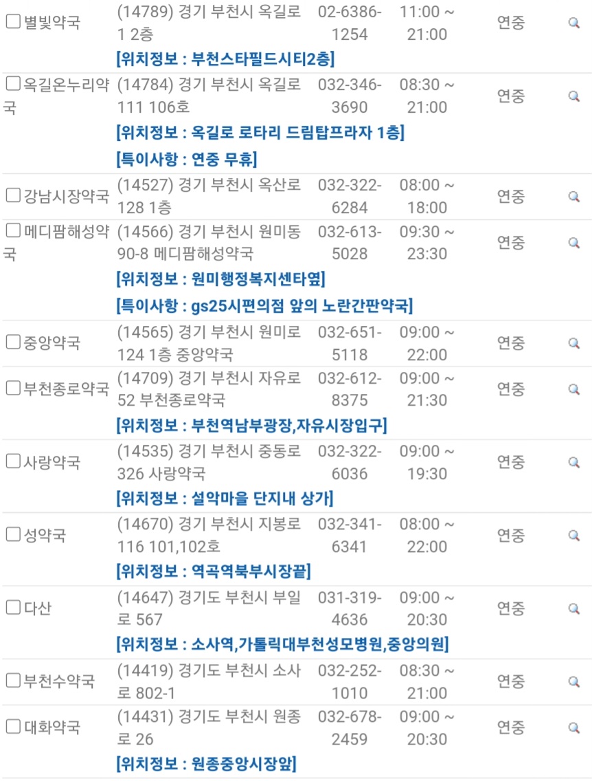 - 뿌리약국: 부천북부역 부천농협 부근, 연중무휴 오전8시30분~새벽1시까지