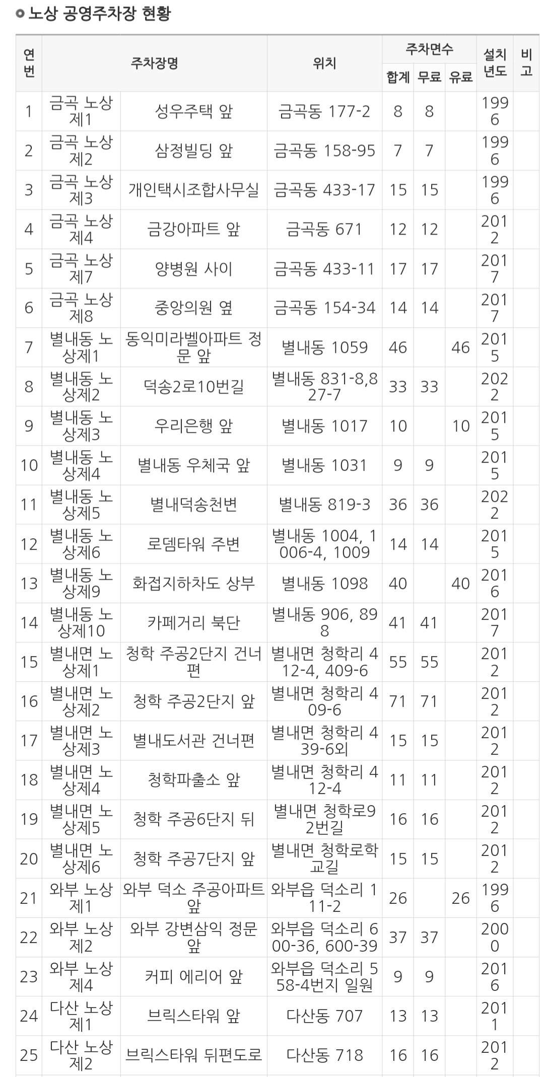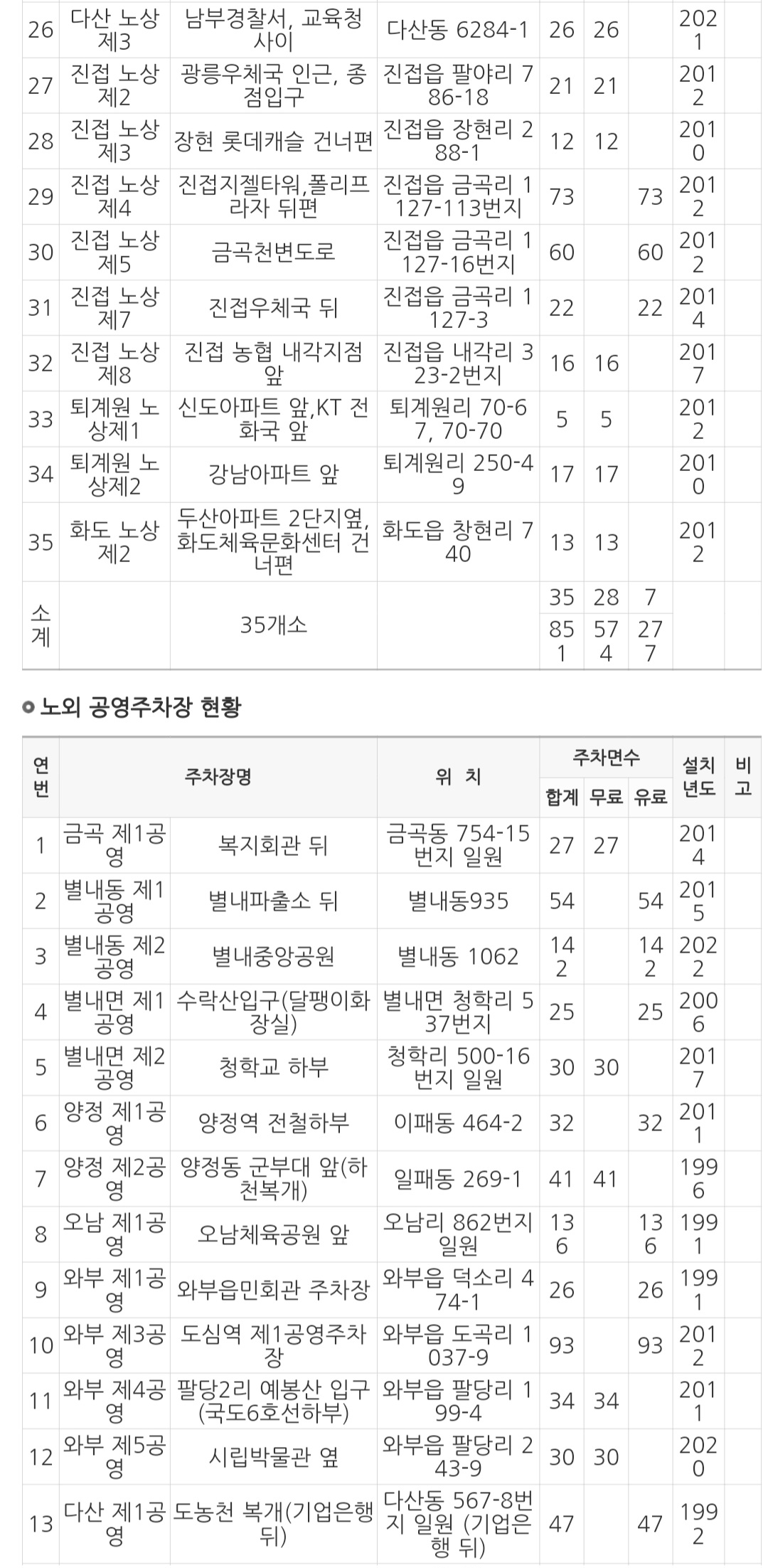 남양주 공영주차장 무료주차장 남양주시 무료 주차장 금곡동 화도읍 마석 별내동 덕소 다산 진접 퇴계원 무료공영주차장