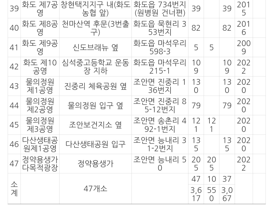 공영주차장 위치, 주차면수, 유료, 무료 구분