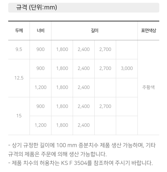 우선 두께는 9.5t ,12.5t, 15t 의 세종류가 있습니다.