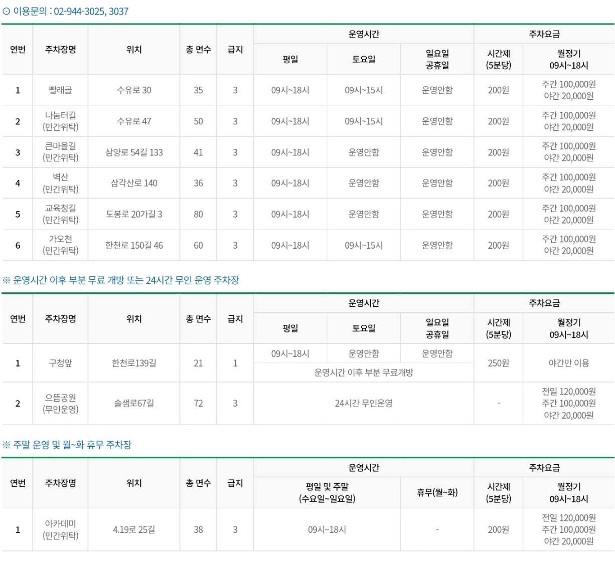 24시간 연중무휴현장 무인정산기 카드결제노상주차장09:00~18:00 (월-금), 토, 일요일은 휴장