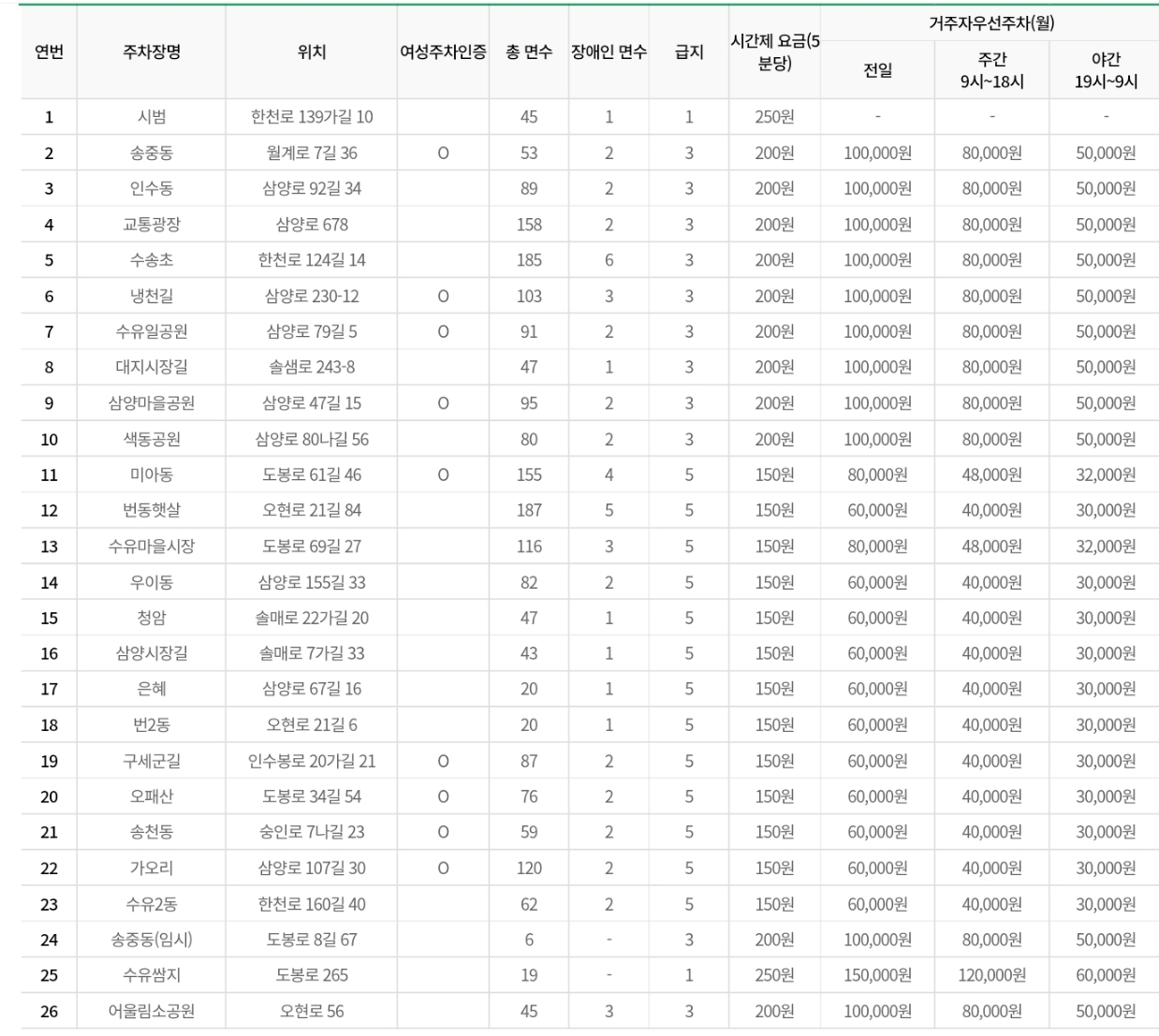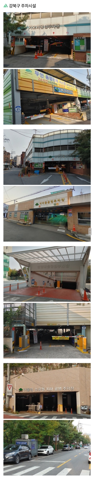 강북구민에게 안전하고 쾌적한 주차공간을 제공하기 위해 주차수요를 유발하는 장소에 설치된 주차장으로 최근 빠르고 편리한 주차서비스를 제공하기 위해 무인주차요금 정산시스템을 도입하여 운영하고 있습니다.