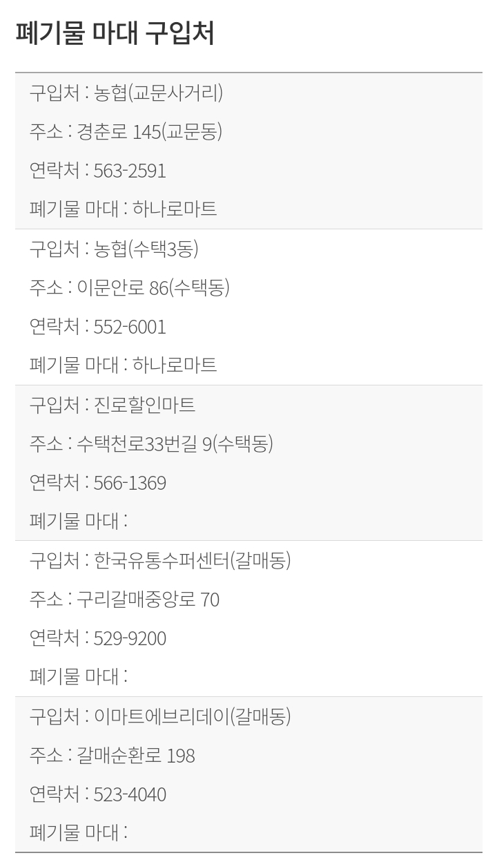 -관내 가까운 동주민센터에 수수료 납부 후 신고필증을 발급받아 지정된 날짜에 배출구리시 폐기물마대 구입처