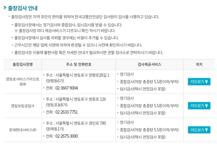 출장검사장은 지역주민의 편의를 위해 한국교통안전공단 검사원이 검사를 시행하고 있습니다
