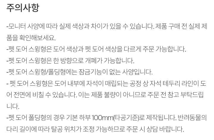요즘은 아파트 천정고가 2400 정도 되고 문짝도 무려 2300이 넘는 신축 아파트가 종종 있어서 문이 큰 사이즈로 제작되는 것이 참 다행이네요여림 펫도어는 제작 시 하부 여유공간 80미리(8센티)를 기본으로 여유를 둔다고 하네요