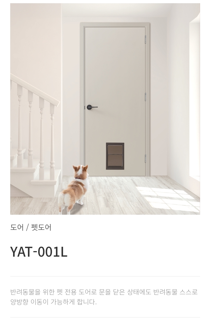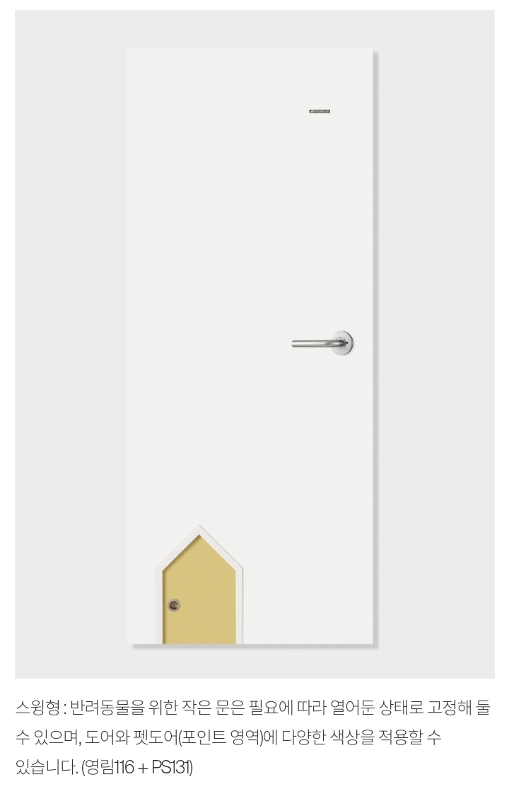 스윙형과는 다르게 아무래도 반려동물이 문을 통과 시에 문턱은 있게 마련이네요출처 영림임업 출처 영림임업 개인적인 생각으로는 스윙형펫도어는 문지방이 없어 편리하지만 본 문짝의 내부프레임인 하단 심재가 끊어진 형태의 문인데