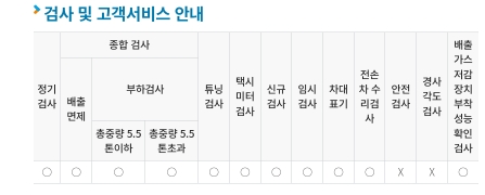 - 정기검사, 종합검사(소형,중형,대형/부하), 임시검사(택시 연장검사 포함)