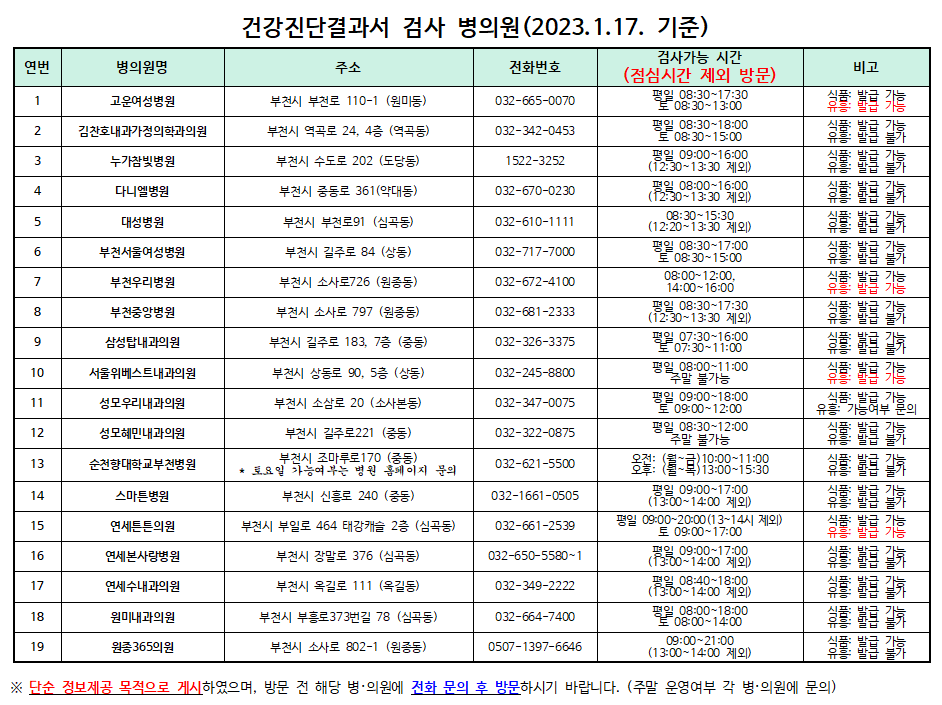 코로나19 대응으로 인해 부천시, 소사, 오정보건소 에서는 부천시민(주민등록등본상 주소지 기준) 대상 으로 건강진단결과서(보건증)를 발급하고 있습니다. 따라서, 발급 가능한 부천시 내 의료기관을 아래와 같습니다.