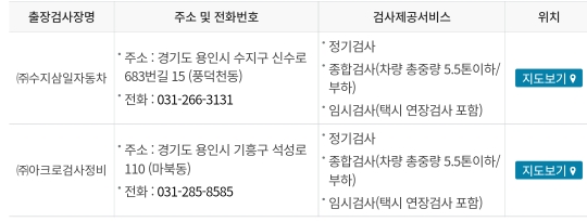 - (주)아크로검사정비: 경기도 용인시 기흥구 석성로 100(마북동)