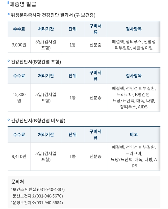 보건증, 건강진단서(B형간염 포함, 미포함)