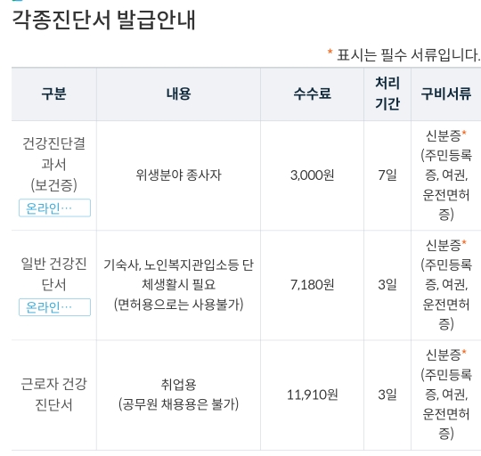 보건증, 건강진단서, 근로자건강진단서 수수료